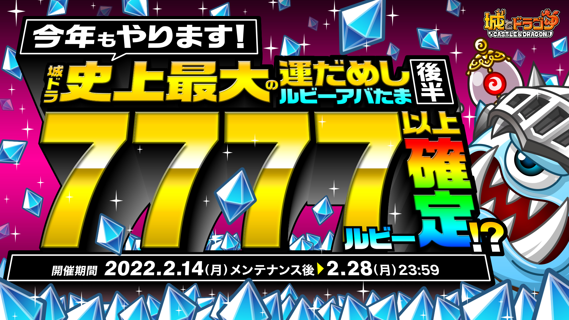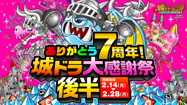 現在開催中の『城とドラゴン』7周年キャンペーン「ありがとう7周年!城ドラ大感謝祭」。本日2月14日(月)からはいよいよ本キャンペーンの“後半”がスタートします。前半に引き続き特別なログインボーナスや、必ず“7777ルビー”以上が当たる「ルビーアバたま」、最高“77777ルビー”と特別なフレームが当たる「大感謝祭!城ドラ宝くじ」なども実施中!既に前半を楽しんだ方もまだの方も、ぜひ1年に1度のお祭りをお楽しみください!