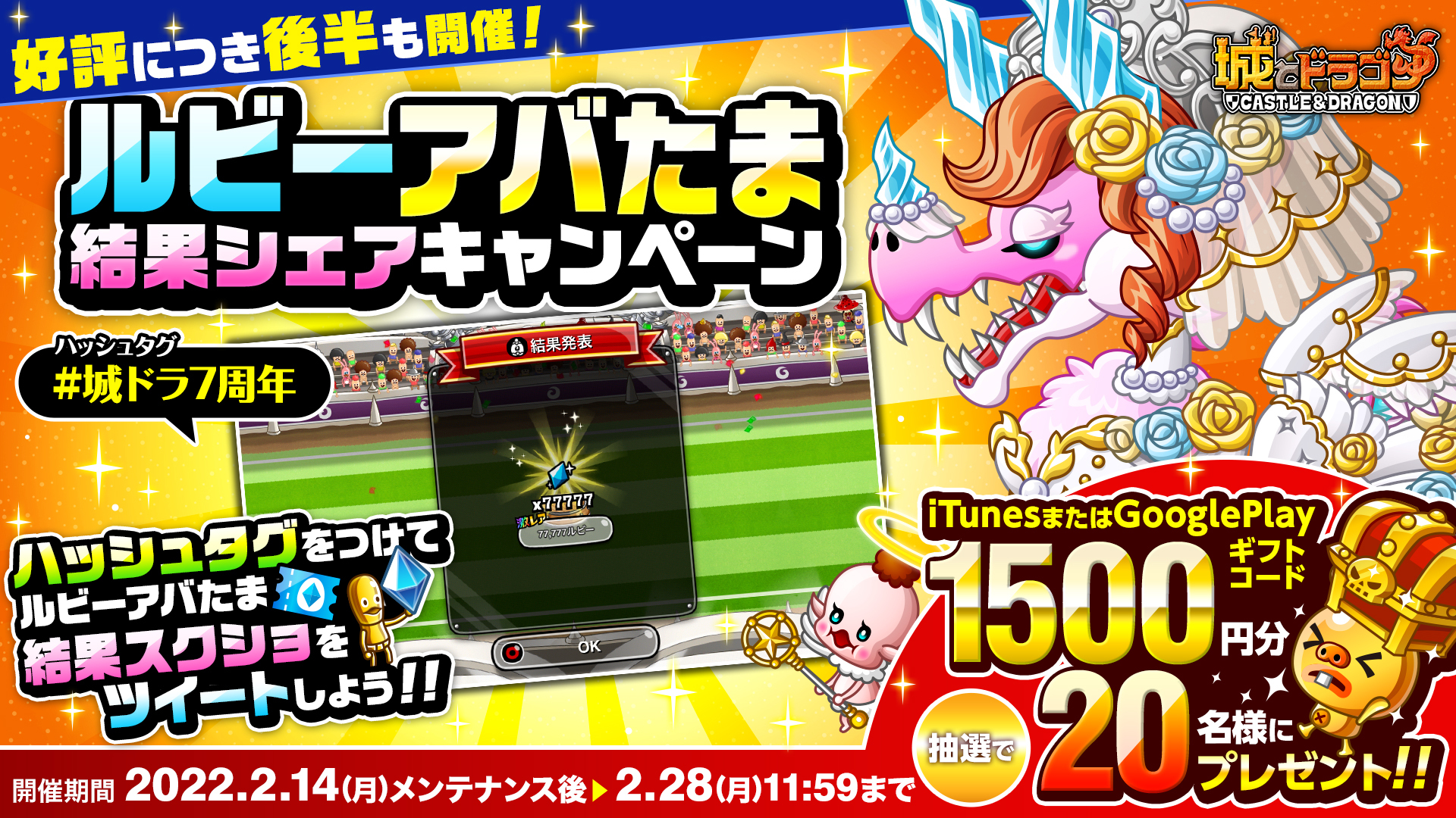 好評につき、2月14日(月)より「ルビーのアバたま結果シェアキャンペーン」をTwitterにて実施いたします。「ルビーのアバたま」結果発表画面のスクリーンショット(動画でも可)とハッシュタグ「#城ドラ7周年」をつけてツイートをしてくださった方の中から抽選で、1,500円分のギフトカード(iTunesカード/Google Playカード)をプレゼントいたします。