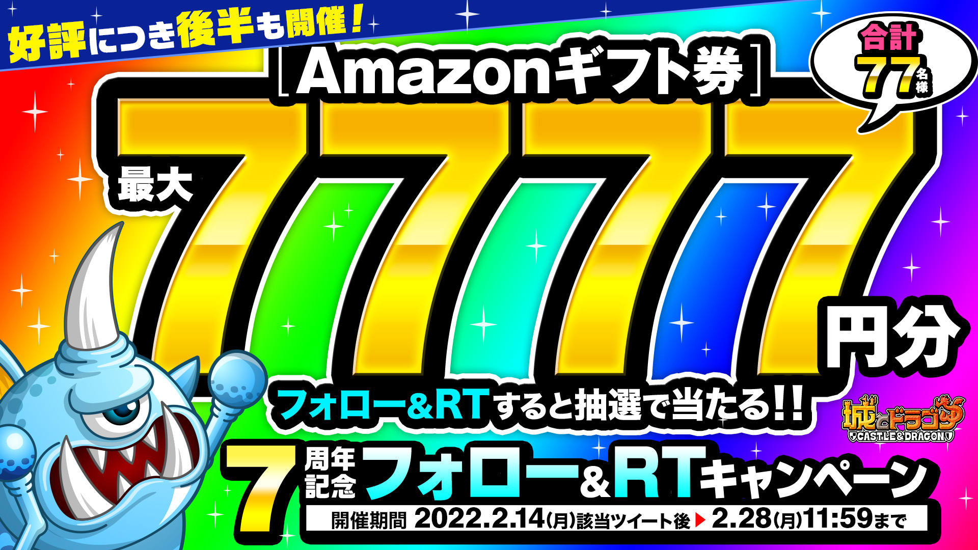 好評につき、2月14日(月)より「7周年記念フォロー&RTキャンペーン」を後半も実施いたします。『城とドラゴン』公式Twitterアカウントをフォローし、対象ツイートをリツイートしていただいた方の中から抽選で、Amazonギフト券7,777円分を2名様、500円分を75名様にプレゼントいたします。
