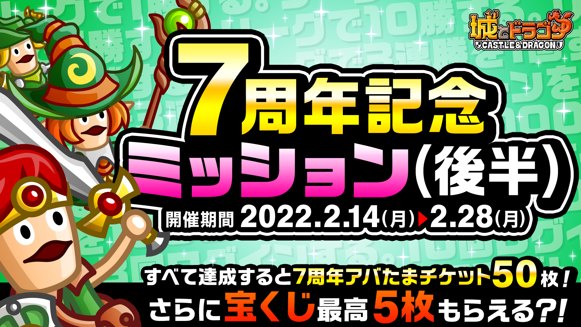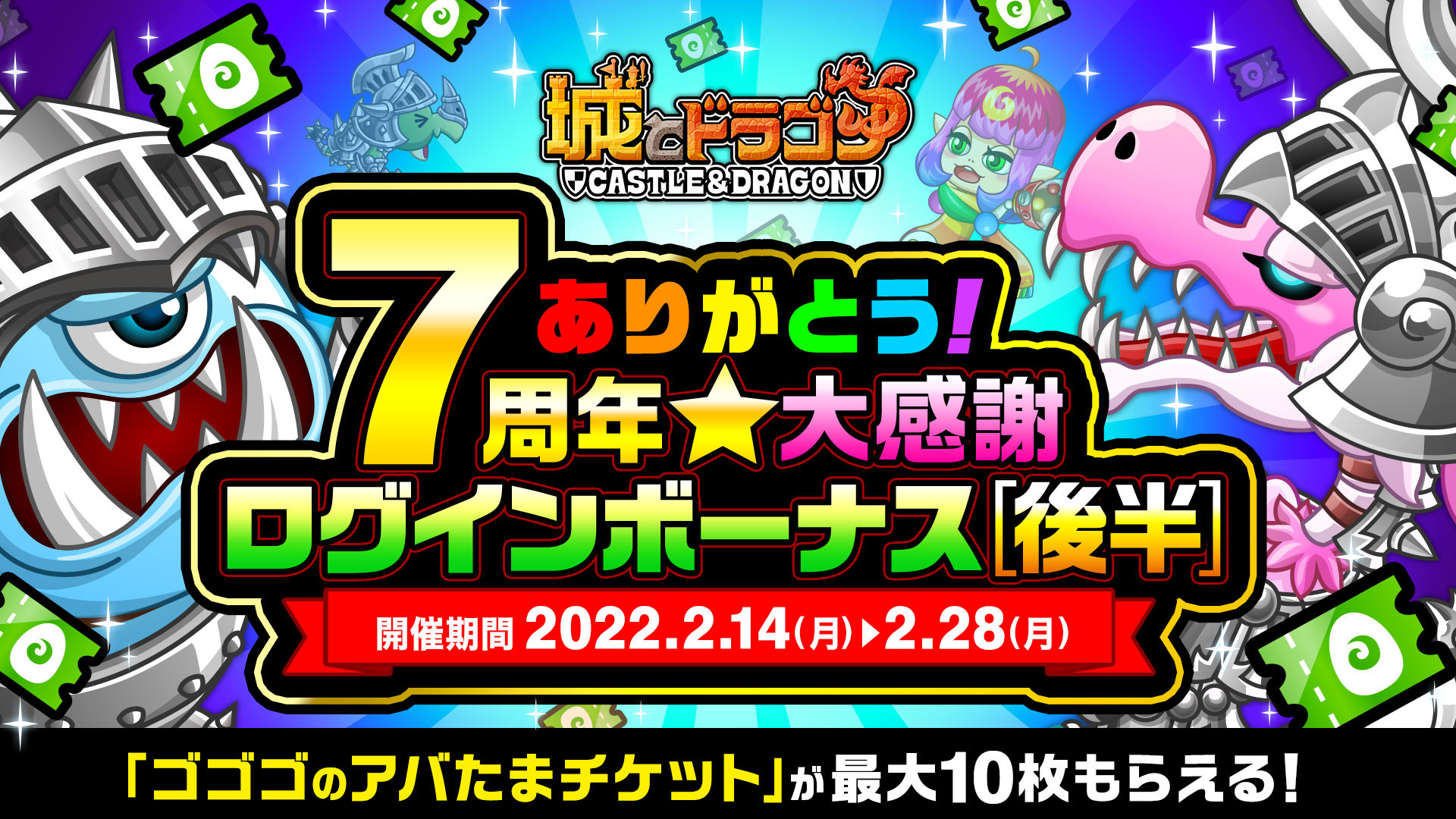 株式会社アソビズム(本社:東京都千代田区、代表取締役:大手智之)は、App Store・Google Playにて好評配信中の『城とドラゴン』で、「ありがとう7周年!城ドラ大感謝祭(後半)」を2022年2月14日(月)より開催いたします。