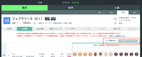 リアルタイムオッズにおいて、オッズ更新日時が表示される仕様の変更とあわせて、無料会員さま向けに更新ボタンの追加を行いました。単勝オッズは1時間に1回の更新ですが最新のオッズを確認したい場合、手動更新(1日3回まで)を実施頂けます。更新ボタンは手動更新の残回数が分かりやすく表示される仕様です。