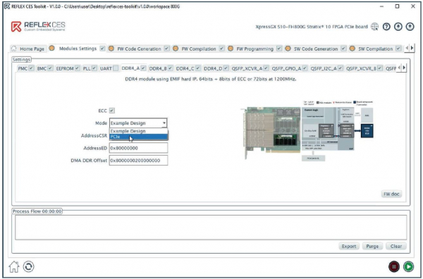 ユーザーは、デザインをすばやく構成してから、ボードをプログラムして、使用可能なすべてのインターフェイスをテストできます。Toolkitは、グラフィカルインターフェイスを介してユーザーが選択したIPおよびテストモジュールを含む、完全なHDLプロジェクトを生成します。