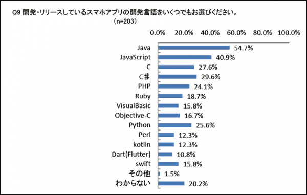 その中で、「スマホアプリを開発している」と回答した人を対象に「開発・リリースしているスマホアプリの開発言語」を尋ねたところ、「Java」と回答した人が過半数と最も多く、次に「JavaScript」と続きました。「Java」はAndroidアプリを開発する際に使用する言語の1つですが、IT業界への就職や人材派遣会社が雇用機会を生み出す際に学習を推奨される言語のため、Java言語を使用する開発者が多いと思われます。