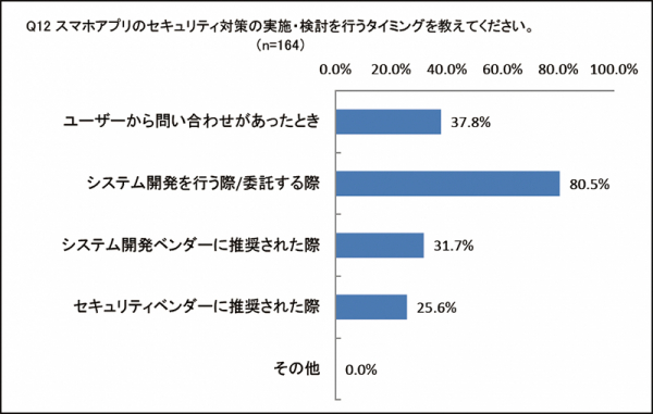 その中で、「スマホアプリを開発している」と回答した人を対象に「スマホアプリのセキュリティ対策の実施・検討タイミング」を尋ねたところ、「システム開発を行う際/委託する際」と回答した人は80.5%で第1位という結果になりました。ユーザーや外部組織から推奨された時ではなく、アプリ開発者が積極的にセキュリティ活動の必要性を感じていることが見受けられました。