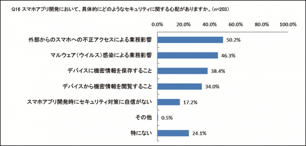 そして、「スマホアプリを開発している」と回答した人を対象に「スマホアプリ開発において具体的にどのようなセキュリティに関する心配があるか」を尋ねたところ、「外部からのスマホへの不正アクセスによる業務影響」と回答した人は50.2%、次いで「マルウェア(ウイルス)感染による業務影響」が46.3%という結果になりました。調査結果から、業務影響を心配するものが中心として挙げられましたが、機密情報に対する心配も挙がりました。