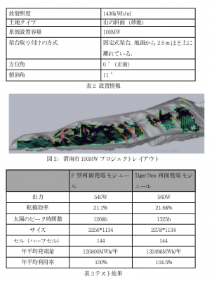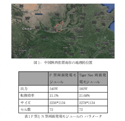2022年2月15日、ジンコソーラーは中国陝西省渭南市における100 MWプロジェクト(34°50 N、109°50 E)について、シミュレーションを行った。シミュレーションでは、ジンコソーラーTiger Neo N型560 W両面発電モジュールと従来のP型540 W両面発電モジュールの発電性能をそれぞれ比較した。プロジェクト現地の放射照度は1436kWh/m2で、平均温度は13°Cである。今回のシミュレーションでは、シミュレーションソフトPVsystを用いて2つのタイプのモジュールの発電性能を測定した。(塵遮蔽による電力損失、モジュール自体の劣化、インバータの損失および温度による電力損失も含まれた。)