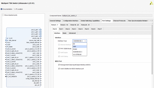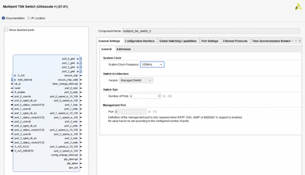 マルチポートタイムセンシティブネットワーキング (M TSN)スイッチIPコアは、TSNエンドポイントまたはブリッジの実装を生成する準備ができている柔軟なHDLコードです。このIPコアには、リソースのトレードオフで最高の機能を実現するために、豊富な汎用パラメーターのセットが用意されています。TSN IPコアのこの設定は、VivadoGUIを介して実行できます。