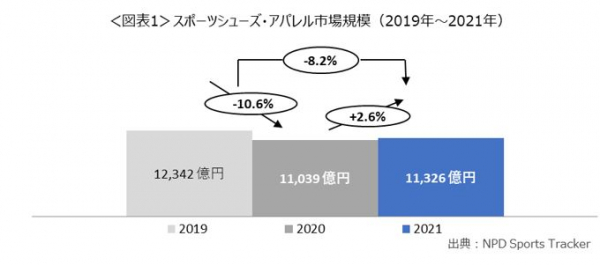 日本の2021年1-12月のスポーツシューズ・アパレル市場規模は11,326億円で前年比2.6%増と、新型コロナウイルスの影響からの緩やかな回復を見せました(図表1)。ただし2019年比では8.2%減で、コロナ以前の市場規模と比べると完全な回復には至っていません。