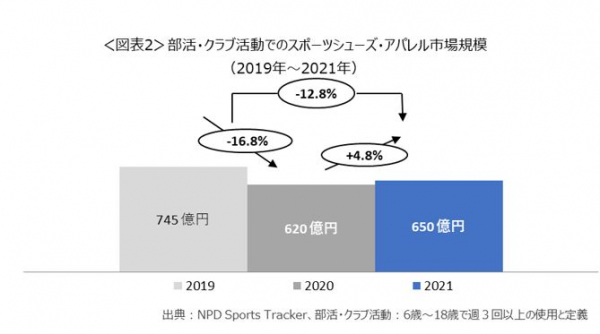 コロナにより大きく活動が制限されていた部活やクラブ活動の市場規模はどうでしょうか。部活・クラブ活動を「6歳~18歳が週3回以上使用する」と定義すると、2021年の市場規模は650億円、前年比4.8%増だったことが分かります(図表2)。コロナ対策を行ったうえでの活動や大会の開催が一般的になったことで2020年からは回復を見せましたが、コロナ以前と比べると12.8%減と、まだ大きな制限を受けていることが見て取れます。