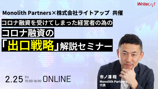 株式会社ライトアップ(本社:東京都渋谷区、代表取締役社長:白石崇、以下ライトアップ)と、モノリスパートナーズ(本社:茨城県守谷市、代表取締役:市ノ澤翔)は、コロナ融資を満枠まで受けてしまった経営者向けの資金繰り改善ノウハウを解説するオンラインセミナーを共同で開催いたします。