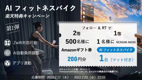 楽天で販売中のNEXGIM MG03 AI フィットネスバイクについて、2022年2月17日12:00よりAFUストアのTwitter公式アカウントで、フィットネスバイク1台が1名様、Amazonギフト券200円分が500名様に抽選で当たる「楽天特典キャンペーン第1弾」を開催しました。