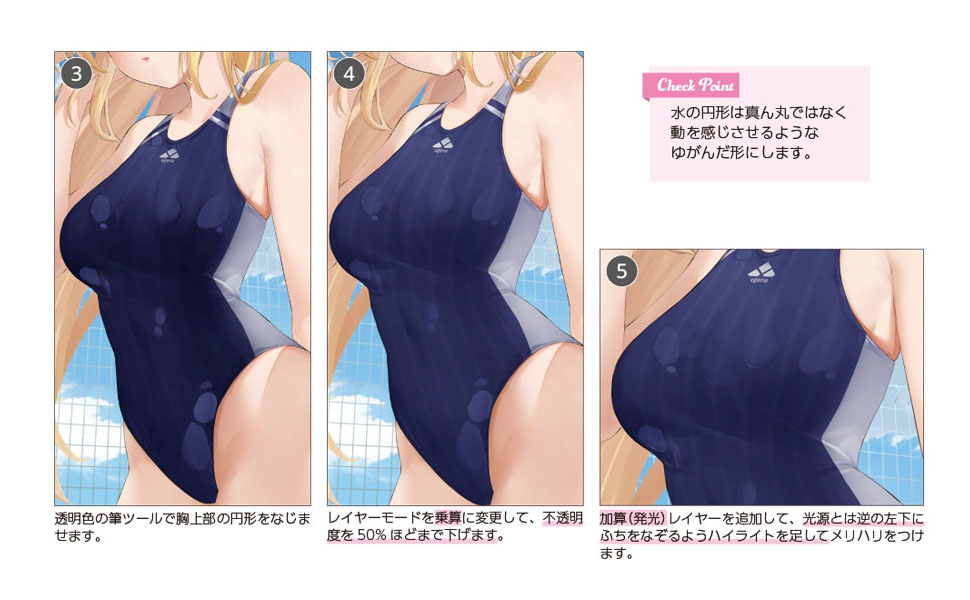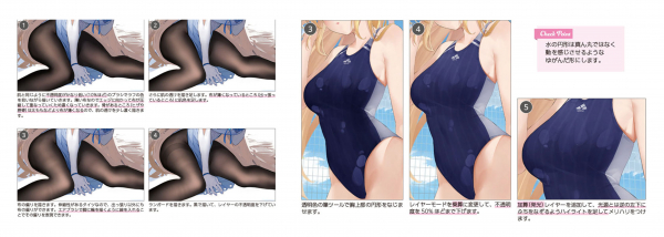 タイツ、競泳水着などコスチュームの塗り表現や、水着を塗る際の水濡れ表現など、難しい質感の表現方法もピックアップ!