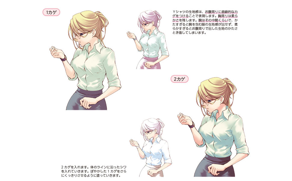 また、第一章では塗り初心者向けに普通体型、小さめ体型、グラマー体型、といった体型別の解説に加え、セーラー服やYシャツなど衣装別の解説も掲載しています。