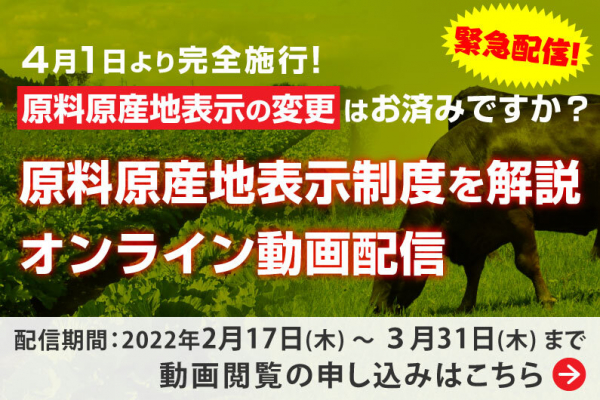 現状でも未だ対応しきれていない食品事業者が多数見受けられることから、本日より「原料原産地表示の変更はお済みですか?」と題した動画を期間限定で配信することとしました。食品メーカー様で「原料原産地表示制度」について、気になる方は是非お申込みください。