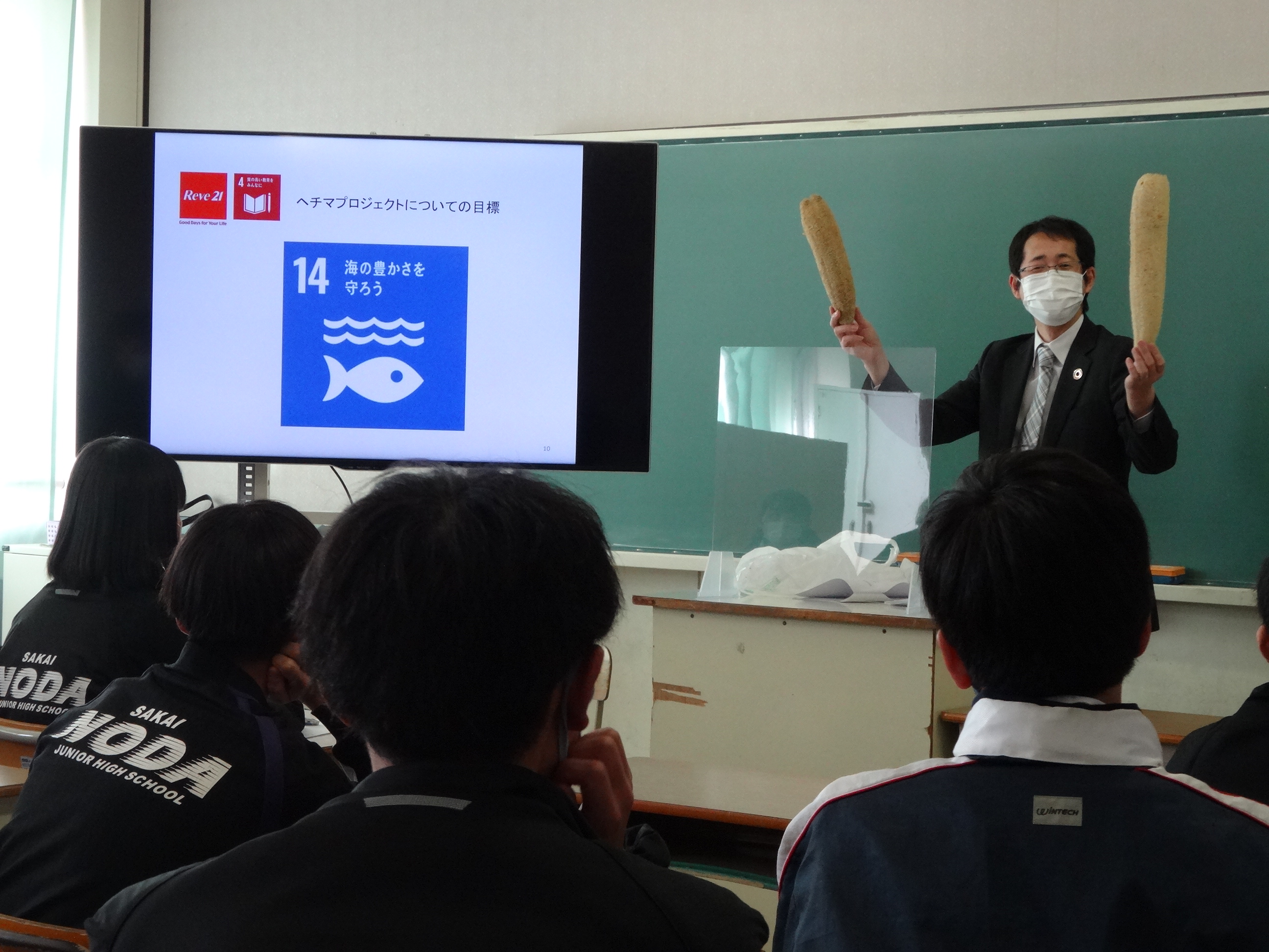 リーブ21は、SDGs活動の一環で、堺市立野田中学校の2年生23名に対して「SDGs部の仕事」について春日井(リーブ21・SDGs部)が講話を行いました。