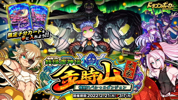 株式会社アソビズム(本社:東京都千代田区、代表取締役:大手智之)は、App Store・Google Playにて好評配信中のリアルタイム合体カードバトル『ドラゴンポーカー』で、2022年2月21日(月)より復刻スペシャルダンジョン「妖怪虚神伝 金時山 本家」を開催いたします。