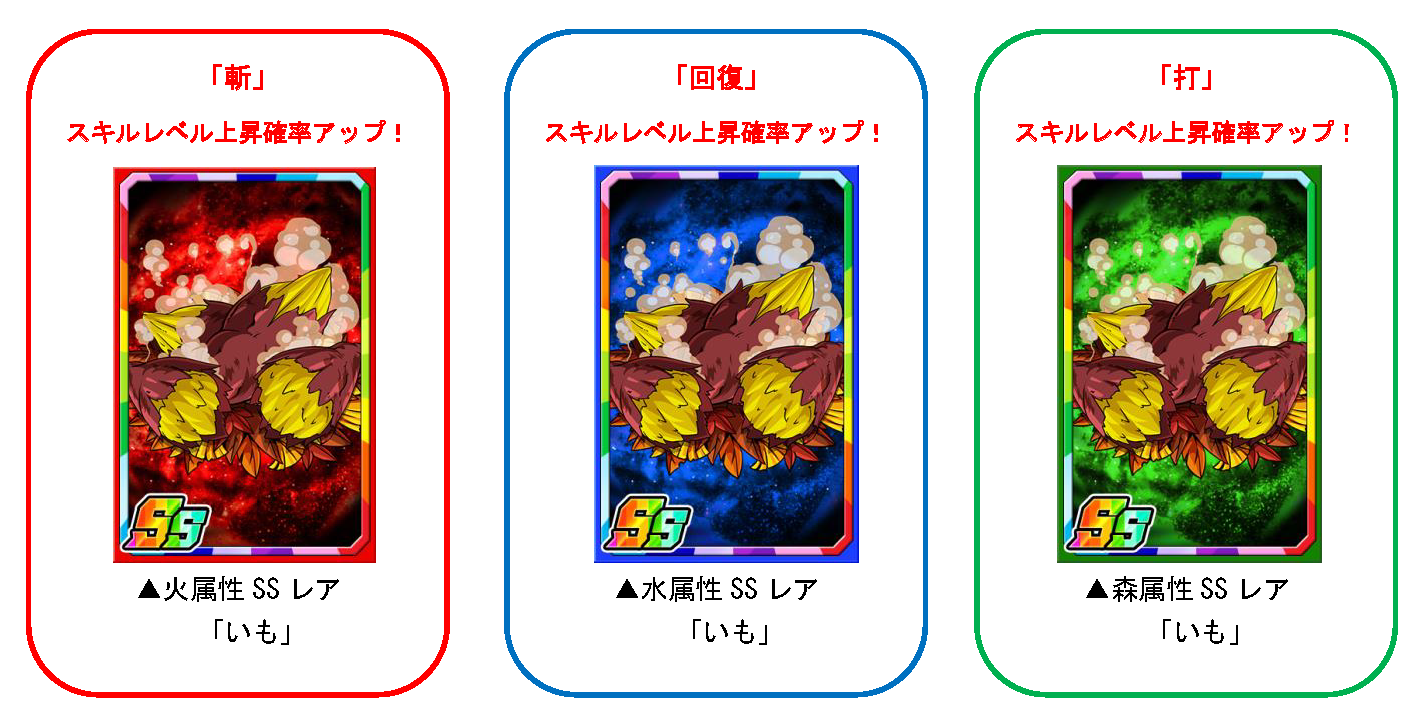 「金太郎P」を使い素材ガチャを回すと、限定の強化素材「いも」を手に入れることができます。限定強化素材「いも」は一部のモンスターに使うと強化値2倍の効果があるほか、斬スキル・回復スキル・打スキルのスキルレベル上昇確率もアップします。