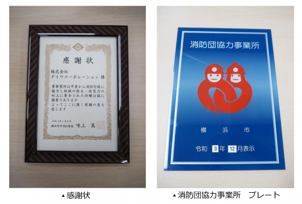 本取り組みに対し、2022年2月1日(火)当社会議室にて、中消防署 味上篤署長より感謝状と消防団協力事業所のプレートをいただきました。