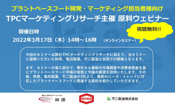 まず、セミナーの導入部分で、弊社から最新の市場調査や消費者調査を基にプラントベースフード市場の実態と今後の展望を説明いたします。その後、株式会社林原、株式会社亀田製菓菓、不二製油株式会社の3社より、最新のニーズ・トレンドに対応したプラントベースフードに関連する原料を紹介していただきます。