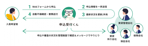 入居希望者がWEB上で入力した申込に必要な情報や申込手続きの進捗を、賃貸不動産管理会社、賃貸不動産仲介会社、家賃債務保証会社、保険会社などに連携し、申込書提出から審査までのやりとりを効率化することができる、不動産関連WEB申込受付システムです。現在、「申込受付くん」による賃貸物件電子入居申込数は年間約50万件(※3)で「入居申込サービス利用数 No.1」(※4)を獲得、国内57社の保証会社と連携しています。