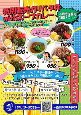 有限会社マジカルエッグ(本社:東京都足立区)が展開するデリバリー専門のヴァーチャルレストラン「ガリバタ亭 丼Don」で提供している人気メニュー4品を、東京・墨田区で運営するスープカレー専門店「お江戸スープカレーちゃはや庵」にてスープカレーとセットにして提供。2022年3月1日(火)より1か月間の期間限定での販売です。