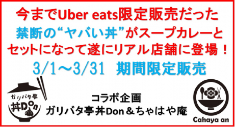 デリバリー専門のヴァーチャルレストラン「ガリバタ亭 丼Don」の人気メニュー4品がスープカレーとのセットになって、東京・墨田区のスープカレー専門店「お江戸スープカレーちゃはや庵」にて3月1日(火)より1か月間限定で販売。スタッフの“賄い飯”から誕生したこだわりの丼メニューを、実店舗で出来立てを食べたいというお客さまの声にお応えして期間限定で提供します。