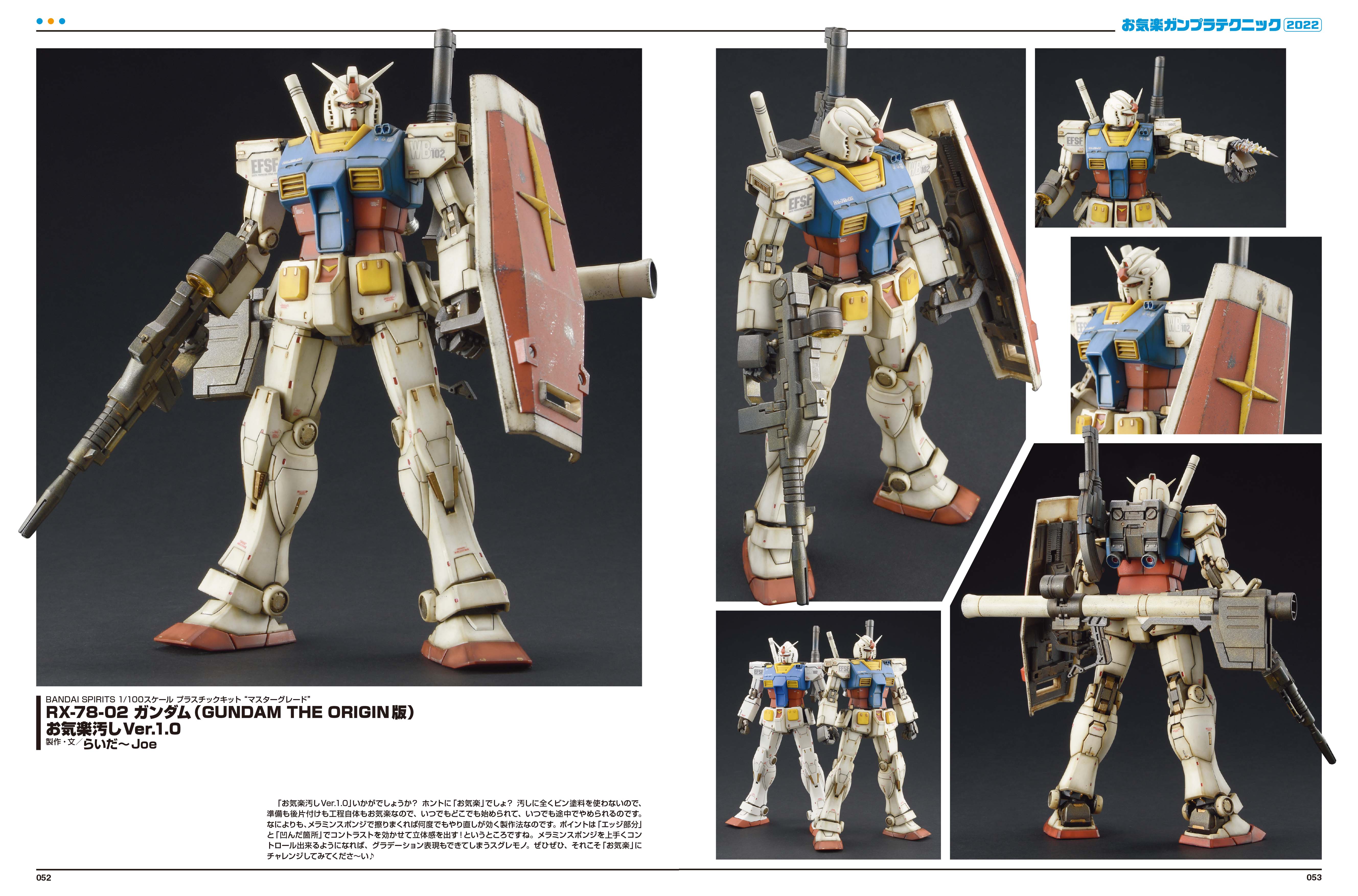 汚しテクニックを使った「RX-78-02 ガンダム」、オリジナル機体「Hi-νガンダム 陸戦イメージ Ver.」のほかに、「ザクII デザートカラー風」「アッガイ」などの作例も合わせて掲載いたします。