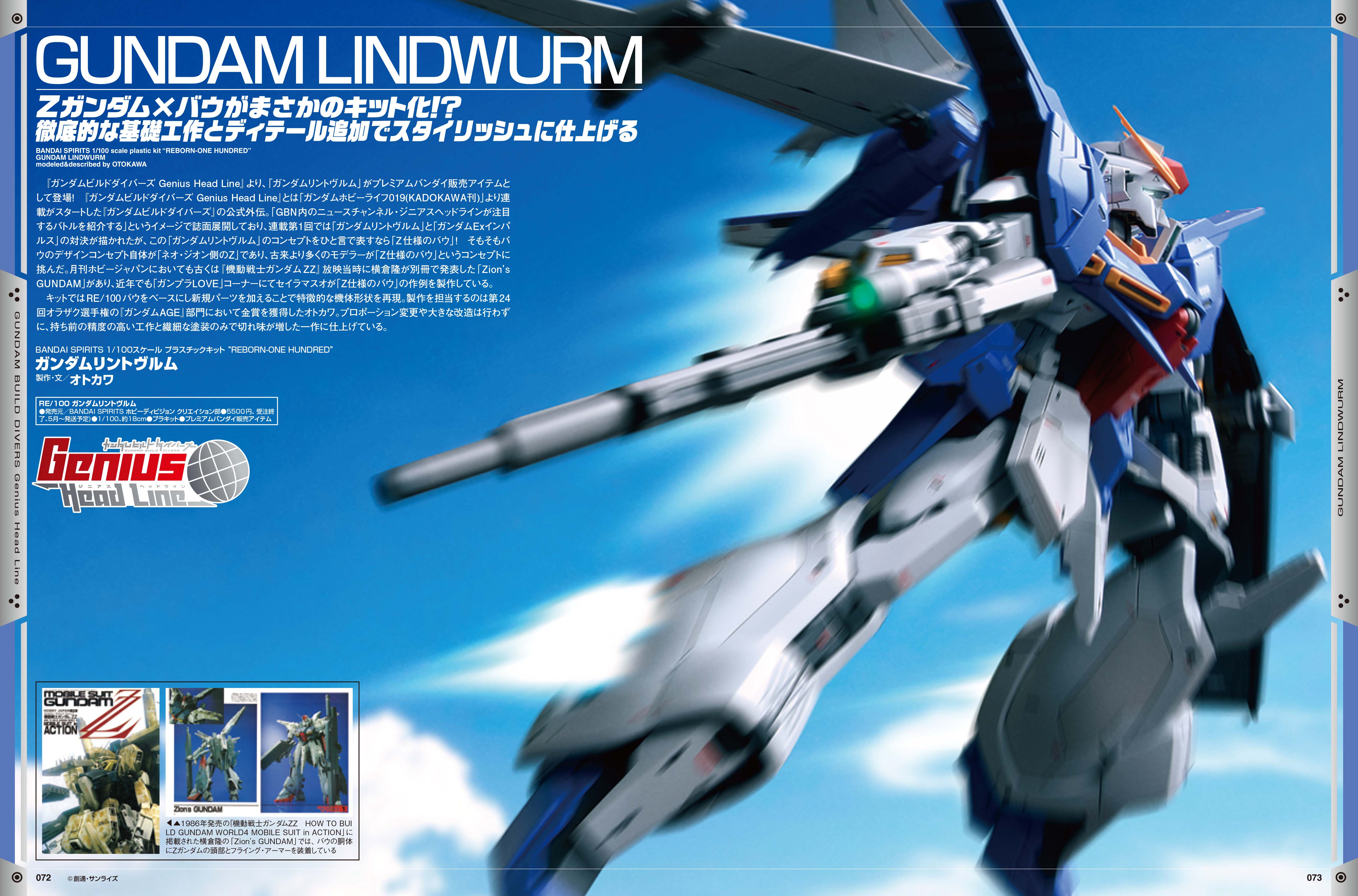 『ガンダムビルドダイバーズ Genius Head Line』より、プレミアムバンダイ「RE/100 ガンダムリントヴルム」の作例を掲載!本キットの製作を担当するのは、第24回オラザク選手権『ガンダムAGE』部門において金賞を獲得したオトカワ。プロポーション変更や大きな改造は行わずに、持ち前の精度の高い工作と繊細な塗装のみで切れ味が増した一作に仕上げています。