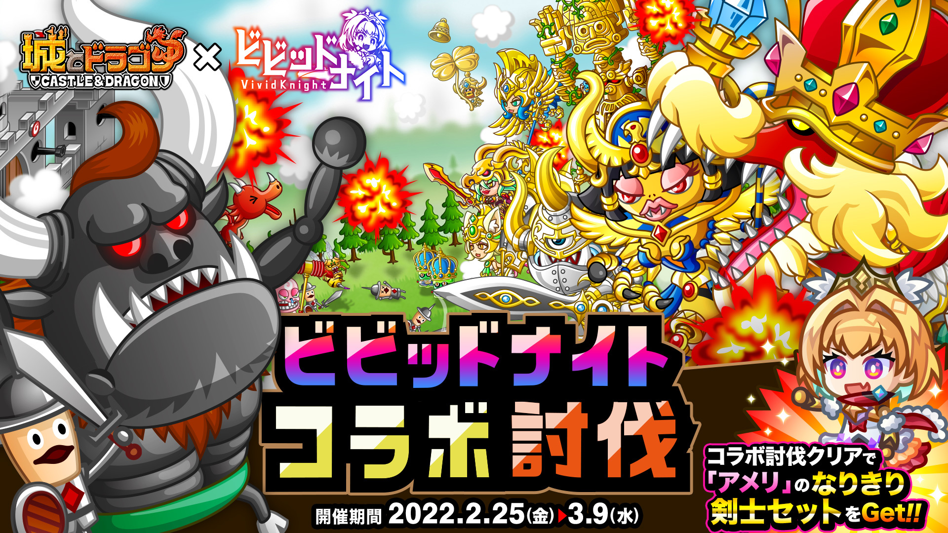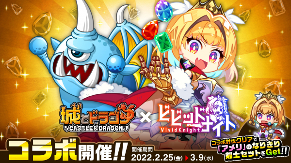 株式会社アソビズム(本社:東京都千代田区、代表取締役:大手智之)は、App Store・Google Playにて配信中の『城とドラゴン』で、iOS/Android版『ビビッドナイト』配信記念コラボを2022年2月25日(金)より開催します。