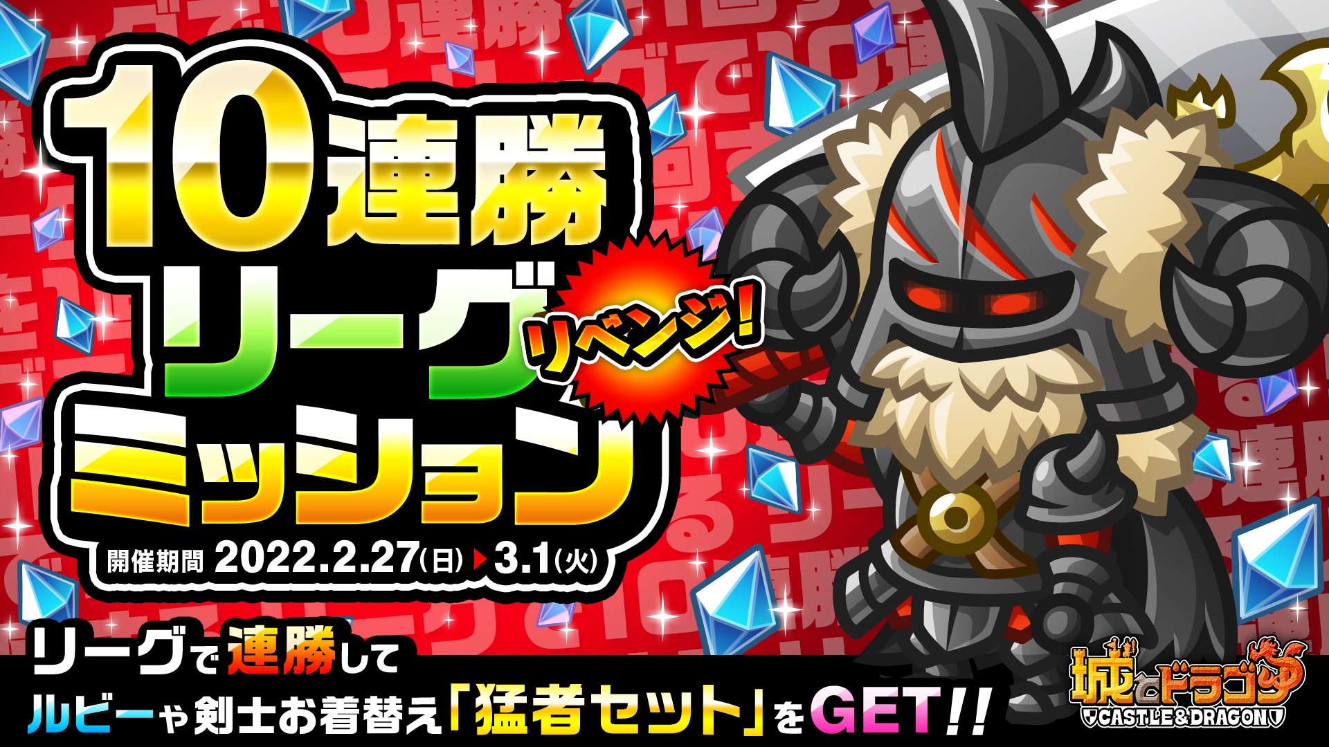上記期間中の「リーグ」イベントを対象とした特別ミッションが再び登場!連勝数に応じてルビーや猛者の証である剣士お着替え“猛者セット”が手に入ります。ぜひバトルにぜひ挑戦してみてください。