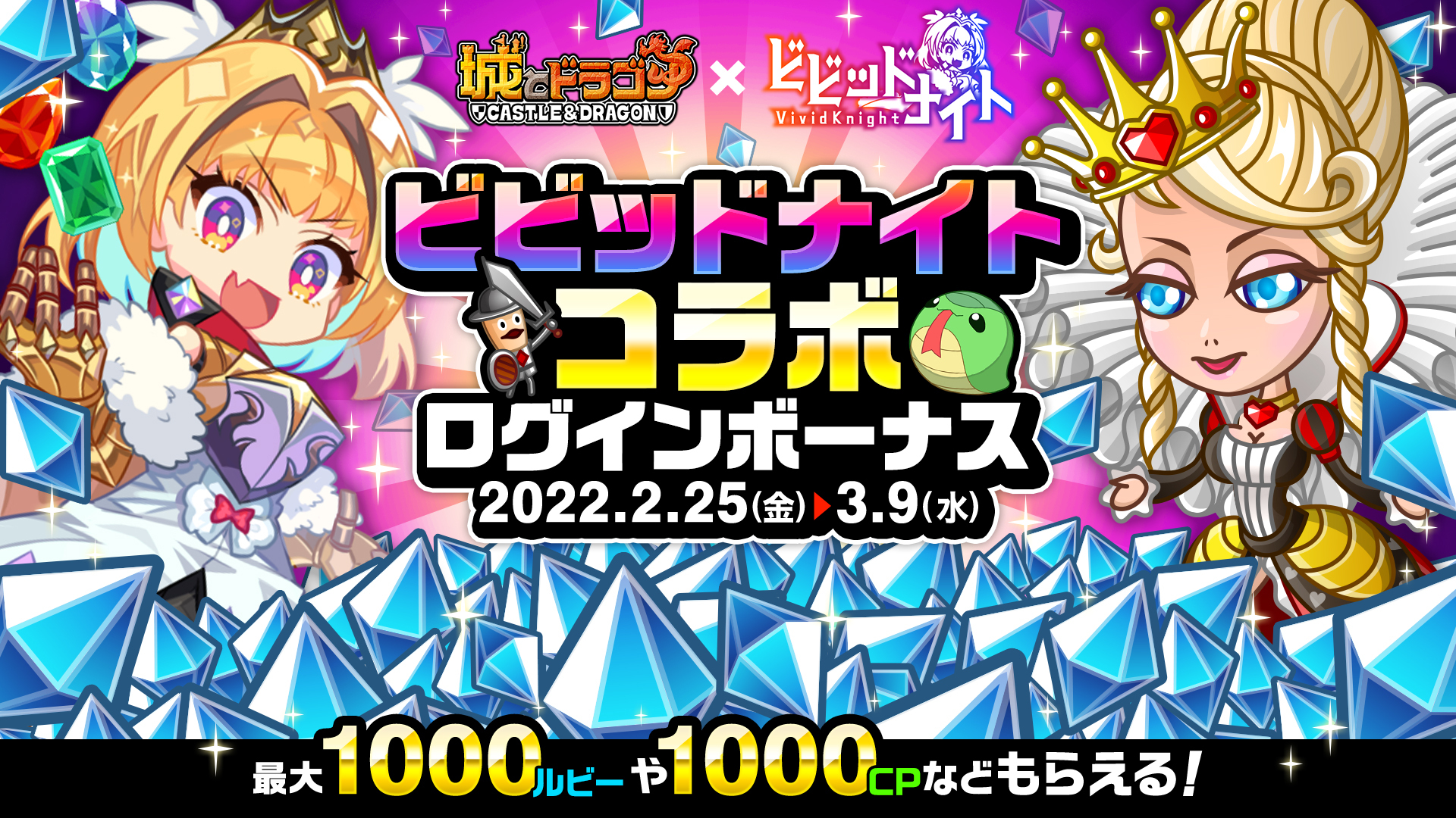 2月25日(金)メンテナンス後より、ゲームにログインすると最大1000ルビーや1000CPがもらえる「ビビッドナイトコラボログインボーナス」を開催。さらに、ドラメダパスや友トレ玉満タン回復もプレゼント!報酬は期間中1日1回、最大13日間プレゼントされます。