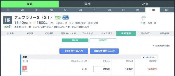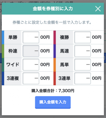 また、買い目登録後に簡単に金額組み合わせができるよう、全ての買い目に金額を入力できる「全一括入力」と券種ごとに設定した金額を入力できる「馬券別に入力」するボタンを追加しました。