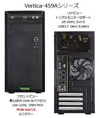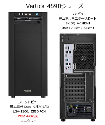 Vertica-459Aシリーズ および Vertica-459Bシリーズは、LGA-1200ソケット(H5ソケット)第11世代/第10世代Core-i9/i7/i5/i3 CPUを搭載し、Aシリーズは3台までの2.5インチドライブ または 2台までの3.5インチドライブを、Bシリーズは1台の3.5インチドライブ、2台の3.5/2.5インチドライブと 2台の2.5インチドライブが実装できます。