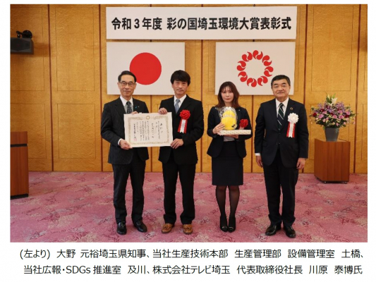 この賞は、埼玉県が環境保全や環境学習等に取り組む個人や団体、環境に関する社会貢献活動等を行う企業を表彰し、その功績をたたえるものです。令和3年度は、39組の応募に対し、審査会による審査の結果、県民部門、事業者部門でそれぞれ1団体が大賞として選定され、当社も受賞企業として、2月9日(水)に埼玉県知事公館にて執り行われた表彰式に参加いたました。