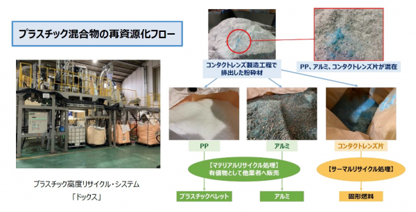 シード鴻巣研究所(埼玉県鴻巣市)のコンタクトレンズ製造工程で、産業廃棄物として処理していたプラスチック混合物を、有価物に再資源化するフローとして2021年4月にサーキュラーエコノミーシステムを構築いたしました。プラスチック混合物の再資源化は、産業廃棄物リサイクル処理業を担う株式会社ダイトクが当社用に開発したプラスチック高度リサイクル・システム「ドックス」を用いて行っています。コンタクトレンズの製造工程で排出したプラスチック混合物(プラスチック・アルミ・コンタクトレンズ片)を「ドックス」により選別し、分離されたPP(ポリプロピレン)・アルミを有価物として他業者へ販売いたします。PPはプラスチックペレットとなり文具や自動車部品等の各種プラスチック製品へ、アルミは再びアルミとして「マテリアルリサイクル」と呼ばれる“モノからモノ”へと生まれ変わります。分離後に残ったコンタクトレンズ片も、産業廃棄物として「サーマルリサイクル」と呼ばれる固形燃料等にリサイクルされます。また、*BLUE SEED PROJECTではユーザーから使い捨てコンタクトレンズケースを回収し、リサイクル業者に販売、「物流パレット」に再製品化しています。この活動で得た収益は、海洋ごみ問題解決に向けて活動している一般社団法人JEANに全額寄付され、環境保全に役立てられます。