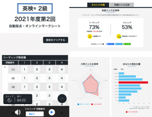 無料の「自動採点サービス」(PC/スマートフォン/タブレット対応)では、問題ごとの正誤だけでなく、技能ごと・大問ごとの正答率も自動で表示されます。