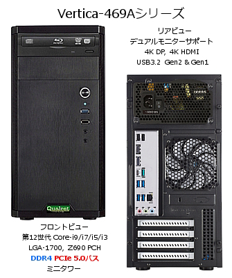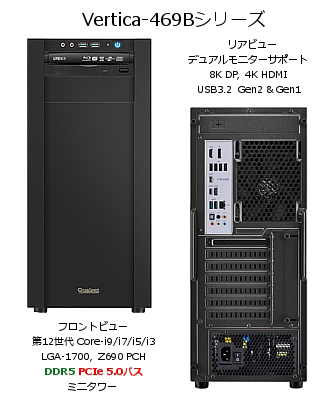 Vertica-469Aシリーズ および Vertica-469Bシリーズは、LGA-1700ソケット(Vソケット)第12世代 Core-i9, i7, i5, i3 CPUを搭載し、Aシリーズは3台までの2.5インチドライブまたは2台までの3.5インチドライブを、Bシリーズは1台の3.5インチドライブ、2台の3.5/2.5インチドライブと2台の2.5インチドライブが実装できます。