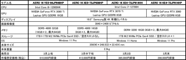 AERO 16シリーズの主な仕様、発売日、市場想定価格(税込)は以下のとおりです。
