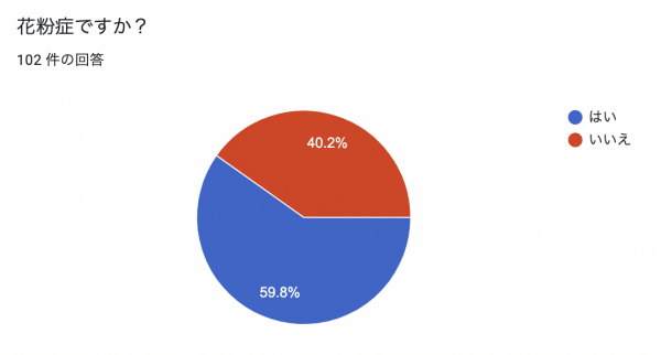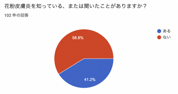 全体102人に対する、花粉皮膚炎を知っているかという質問では、約6割もの人が花粉皮膚炎を知らなかったという結果になりました。花粉症ではないと思っていても、実はアレルギー反応が起きていたり、花粉症だと自覚をしている人でも花粉皮膚炎を知らなかったりすることがわかりました。