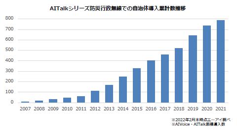 株式会社エーアイ(本社:東京都文京区、代表取締役社長:吉田大介、証券コード:4388、)は、高品質音声合成AITalk(R)シリーズが、2022年2月末時点における全国自治体の防災行政無線への累計導入数780市区町村を越え、2022年中に800市区町村への導入見込みとなることをお知らせいたします。