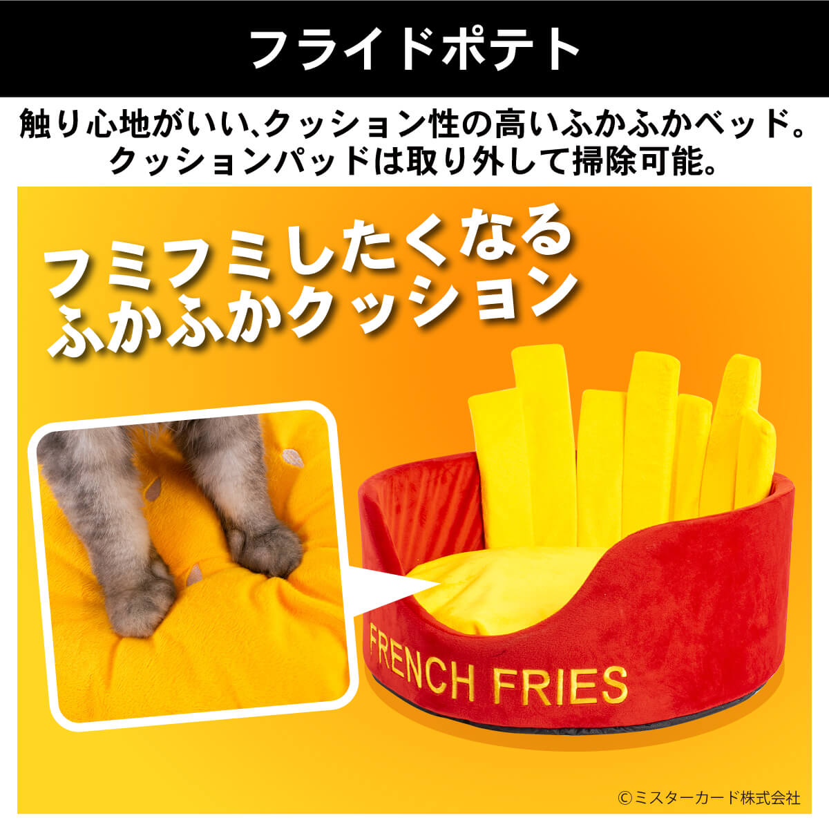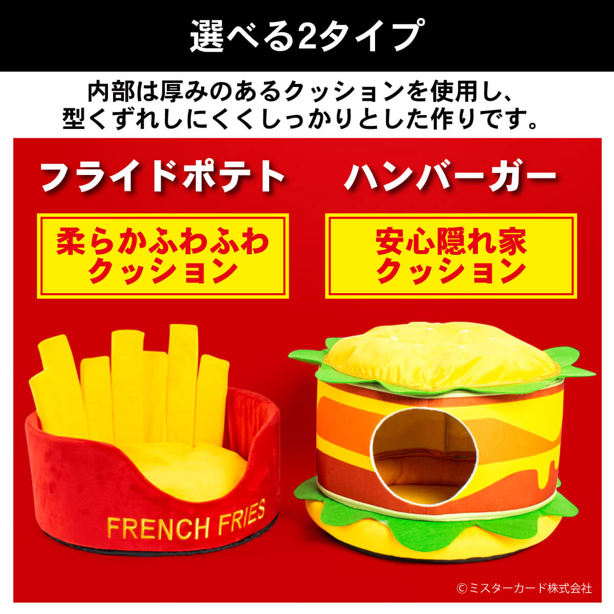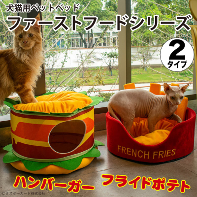ミスターカード株式会社(本社所在地:埼玉県川口市)は、愛犬愛猫が思わず食べたくなるほど可愛いペットベッド「ファーストフードシリーズ」を2022年3月1日(火)に発売いたします。「ハンバーガー」、「フライドポテト」の2タイプをご用意し、触り心地のよいクッション性の高いフカフカなベッドです。丸洗いすれば、いつも清潔で飼い主もペットも嬉しい。