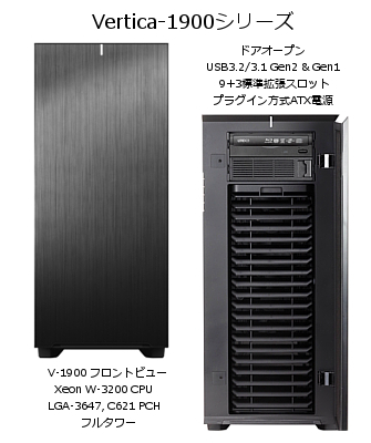 Vertica-1900A/Bシリーズは、LGA-3647 ソケット(ソケットP)Intel Xeon W-3200(64レーン)CPU及び 第2世代Xeon-SP(48レーン)CPUが搭載可能な高性能ワークステーションで、2.5”ドライブベイを2台(最大5台)、2.5”/3.5”ドライブ共用ベイを8台(最大18台)、5.25インチベイを2台装備しています。静音性を向上するフロントドアは、取り外しての運用、左開き、右開きでの運用が可能です。