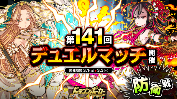 3月1日(火)より、1vs1のリアルタイム対人バトル「第141回デュエルマッチ本戦」を開催いたします。今回のルールは「防衛戦」です。デュエルマッチでは、バトルで獲得できる「デュエルP」に応じてランキングが決まり、リーグ終了時に報酬が獲得できます。また、累計勝利数に応じて、限定カードも手に入ります。相手の心理を読み、1vs1の真剣勝負に挑みましょう!