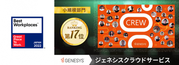 東京 - 2022年3月1日 - カスタマーエクスペリエンス・オーケストレーションのグローバルクラウドリーダーであるジェネシスクラウドサービス株式会社(https://www.genesys.com/ja-jp)(本社:東京都港区、代表取締役社長:ポール・伊藤・リッチー)はこのほど、2022年版日本における「働きがいのある会社」で小規模部門(25~99人)で初めてエントリーし、17位に選出されたことをお知らせいたします。