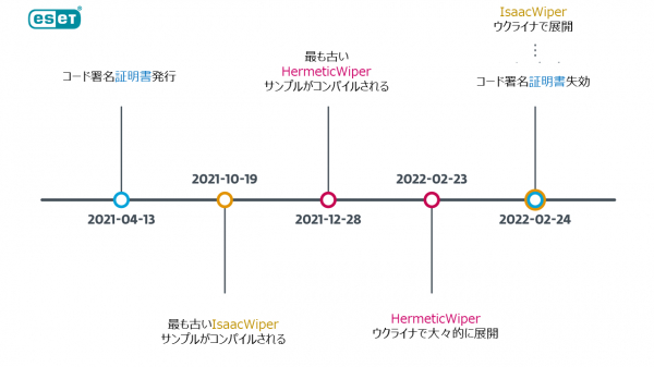 ESETの研究者は、影響を受けた組織は、ワイパーが展開されるかなり前にすでに侵害されていたと考えています。「これはいくつかの事実に基づいています。HermeticWiper PEコンパイルのタイムスタンプの最も古いものは2021年12月28日であり、コード署名証明書の発行日は2021年4月13日です。さらに、HermeticWiperは少なくともひとつのインスタンスでデフォルトのドメインポリシーを介して展開されており、被害者のActive Directoryサーバーの1つに攻撃者が事前にアクセスしていたことを示しています。」とBoutinは述べています。
