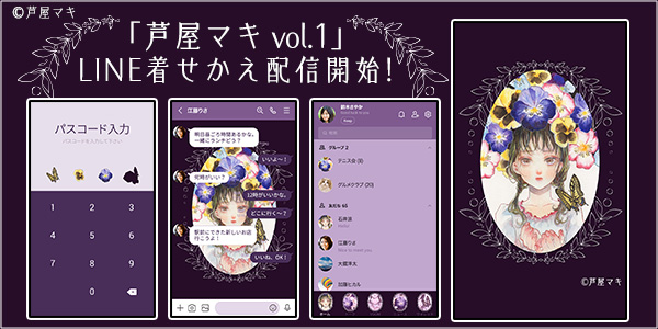 「芦屋マキ」ご本人監修の紫を基調にトーク画面のイラストが目を惹くデザインとなっております!是非LINE着せかえでも「芦屋マキ」の世界をお楽しみください。