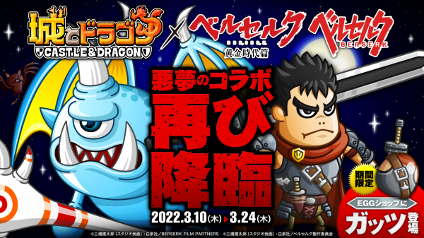 株式会社アソビズム(本社:東京都千代田区、代表取締役:大手智之)は、App Store・Google Playにて好評配信中の『城とドラゴン』で、2022年3月10日(木)より映画『ベルセルク 黄金時代篇』、TVアニメ『ベルセルク』とのコラボを記念し、2022年3月4日(金)よりTwitterにてキャンペーンを開催いたします。