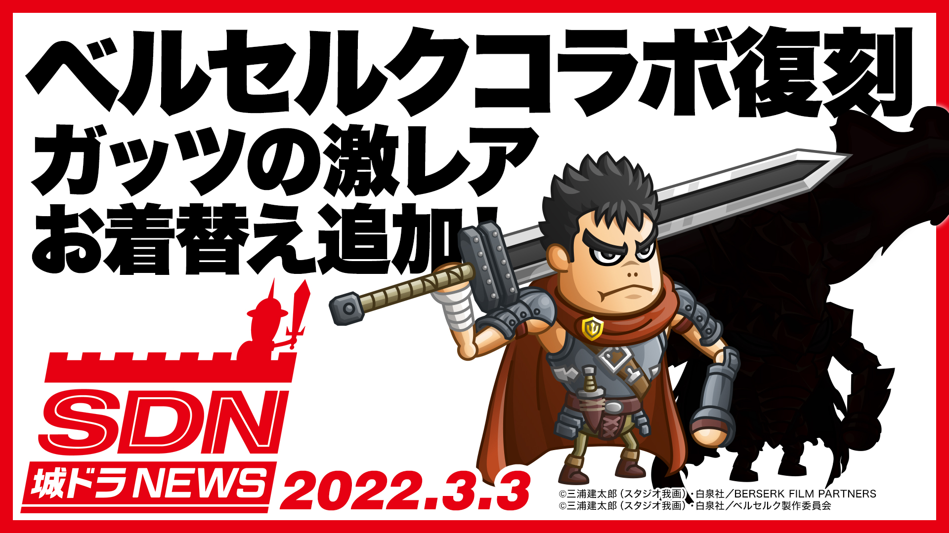 『城とドラゴン』公式YouTubeチャンネル「城ドラNEWS」にて、コラボ限定キャラ「ガッツ」の激レアお着替え「狂戦士・紅セット」やコラボイベント情報を公開!