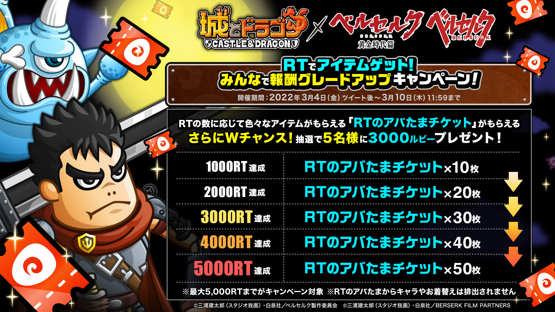 『ベルセルク』とのコラボイベント復刻開催決定を記念して、「RTでアイテムゲット!みんなで報酬グレードアップキャンペーン!」を実施いたします。『城とドラゴン』公式Twitterアカウント(@shirotodoragon)が、つぶやいたキャンペーン対象ツイートの公式リツイート総数に応じて、“挑戦状”や”調子上げアイテム“などといったゲーム内アイテムが当たる「RTのアバたま」の専用チケット“RTのアバたまチケット”をユーザー様全員にプレゼントいたします。さらにWチャンスとして、RTされた方の中から抽選で5名様に、3000ルビーをお贈りします!