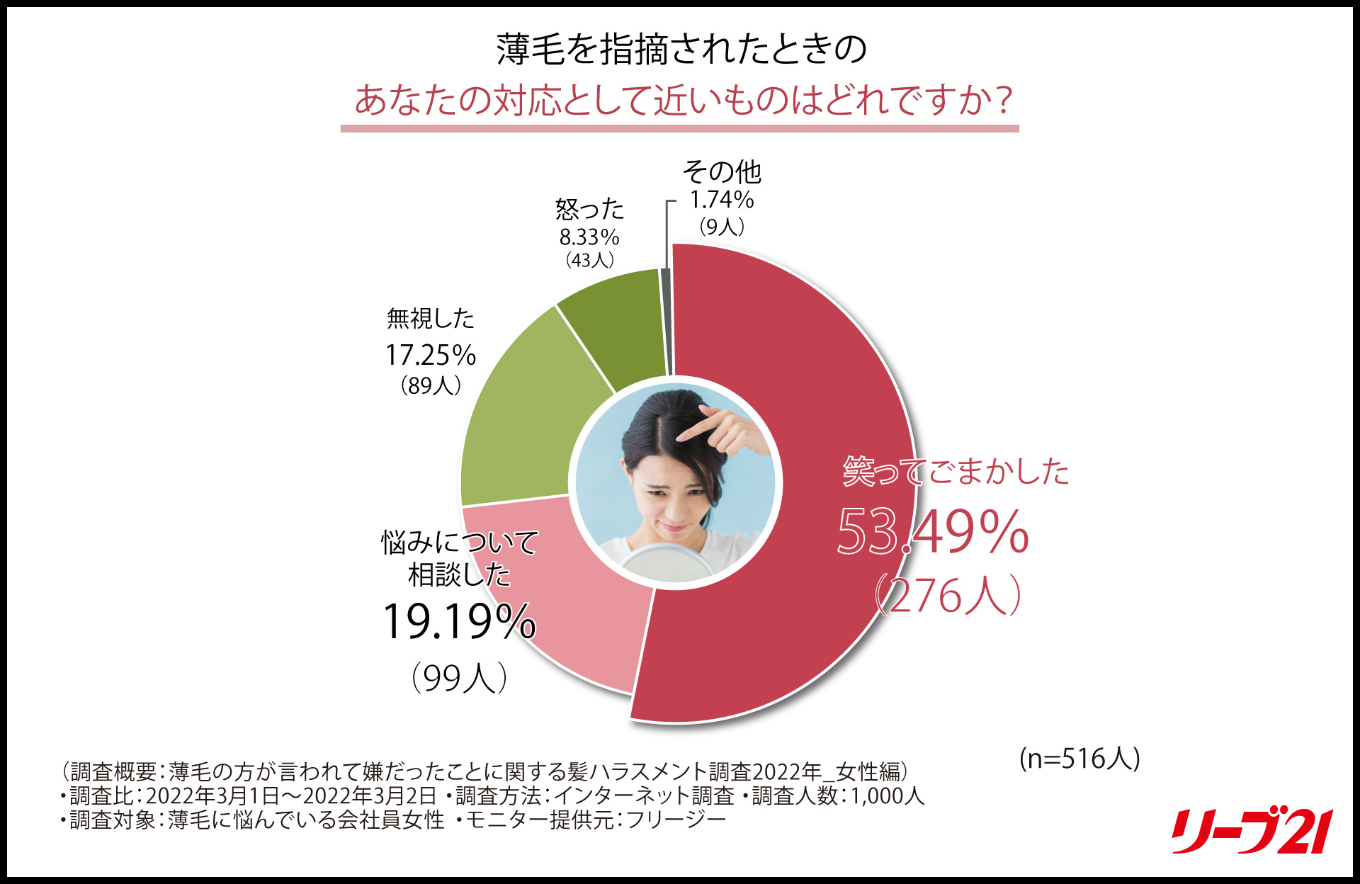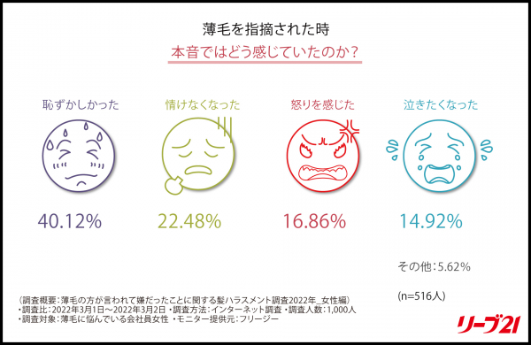 株式会社毛髪クリニック リーブ21(本社:大阪市中央区、代表取締役社長:岡村勝正 以下「リーブ21」)は、薄毛に悩む女性会社員1,000人(20代~60代)を対象に、髪ハラスメント(以下、「髪ハラ」)に関する調査を実施しました。
